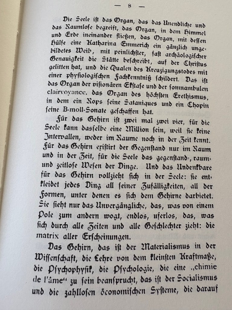 Ulike er veiene, for hjernen, det er hverdagen, ukedagen, matematikken, logikken, og sjelen er en sjelden festdag, det regelløse, lynets glimt, som kaster all logikk over ende.
