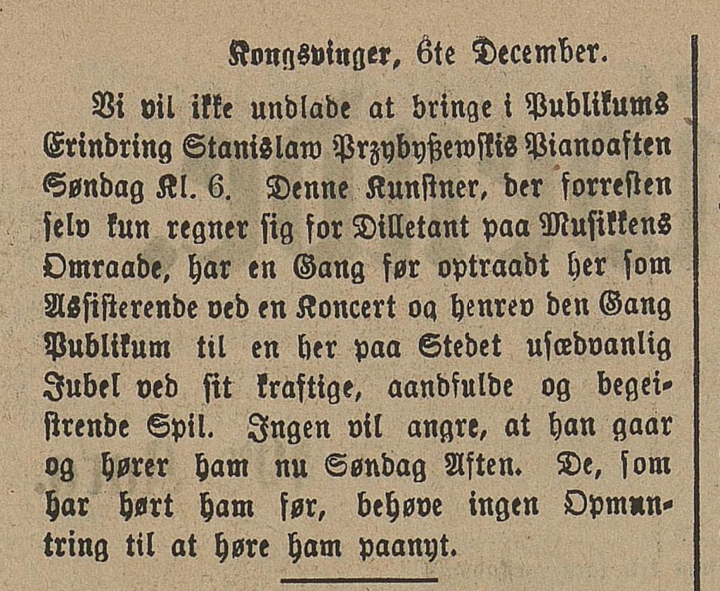 Vi vil ikke unnlate at bringe i Publikums Erindring Stanislaw Przybysewskis Pianoaften Søndag kl. 6. Denne Kunstner, der forresten selv kun regner sig for Dilletant paa Musikkens Omraade, har en Gang før optraadt her som Assisterende ved en Konsert og henrev den Gang Publikum til en her paa Stedet usedvanlig Jubel ved sit kraftige, aandfulde og begeistrende Spil. Ingen vil angre, at han gaar og hører ham nu Søndag Aften. De, som har hørt ham før, behøve ingen Opmuntring til at høre ham paanyt.Hedemarkens Amtstidende, fredag den 6te December 1895